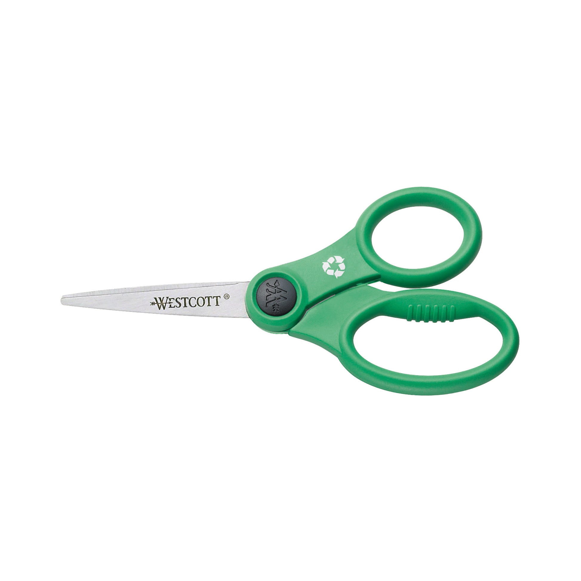 Westcott KleenEarth Scissors 130mm E-32150 00. Stainless steel blades. Finger rest and ergonomic shaped handles for comfort. Handles are made from 70% recycled plastic. Microban antibacterial protection. Size: 130mm/5 inches.
