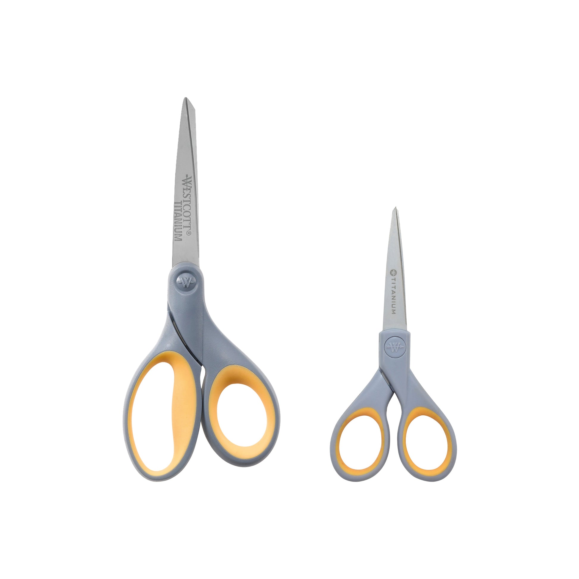 Westcott Titanium Twin Pack Scissors 130/180mm E-13824 00. Titanium coated, stainless steel blades. Resists the stickiness of tape and glue. Soft grip handles. Size: 130mm/5 inches and 180mm/7 inches. Colour: Grey/Yellow.
